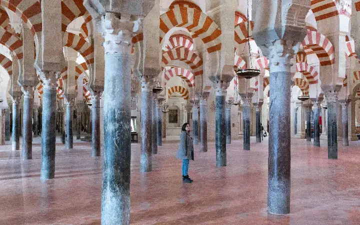 يحوّل المسجد-الكاتدرائية في قرطبة ما يقارب 850 عمودًا إلى إحساس مدهش بالانفتاح. فمن خلال تكرار الأقواس الحدوية، والصنجات الحمراء والبيضاء، ونظام العقود المزدوجة، يوجّه الفضاء البصر بإيقاع ثابت إلى حد يجعل الكثافة تبدو هادئة وفسيحة وشبه بلا نهاية.