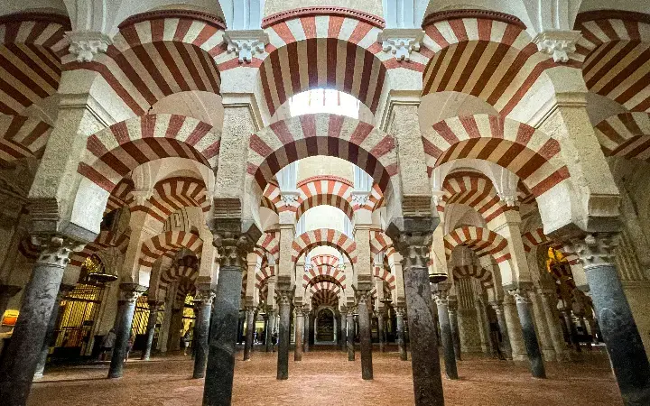 تصبح قراءة مسجد-كاتدرائية قرطبة أسهل حين تبدأ بأشكاله المتكررة: القوس الحدوِي، والصنجات الحمراء والبيضاء، والزخارف المنحوتة. تكشف هذه العلامات الخارجية عن لغة تصميم إسلامية دقيقة لا تزال ظاهرة تحت التاريخ المتعدد الطبقات لهذا الأثر.
