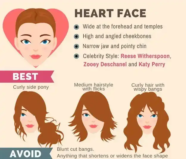 أما إذ أطلتم شعركم فذيل الحصان المرفوع يعتبر تصفيفة ملاءمة لشكل وجهكم، أيضا التموجات الطويلة بتدرج "Layers" ستناسبكم بشدة حيث تعطيكم كثافة في منطقة عظام الفك فتتناسب مع الجبهة العريضة نسبيا. تعتبر "ريس ويزر سبون " أحد المشاهير ذات الوجه الذي يمثل شكل القلب.