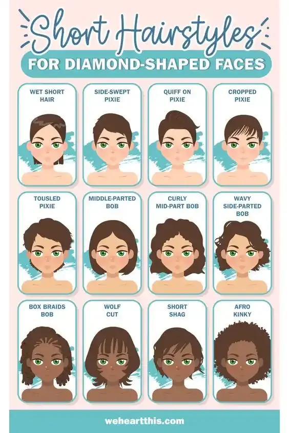 الوجه الماسي تتوازى فيه الجبهة مع الفك وتكون عظام الفك بارزة بوضوح. يفضل أن تتبعوا قصة الطبقات ويقسم الشعر للجانب ويلائمكم أيضا تصفيف الشعر في ذيل حصان للوراء. يلائمكم طرق تصفيف متعددة بصفة خاصة في الشعر الطويل. أحد المشاهير هي جيسيكا ألبا.