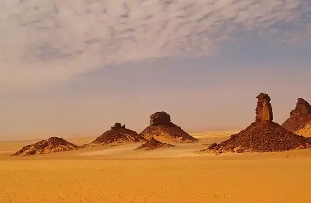 بحلول صباح اليوم الثاني، بعد التخييم في الليلة الأولى على أطراف منتزه طاسيلي نجير، كنا قد ألفنا المواقف التي أصبحت معتادة على مدار رحلتنا البرية: المرشد، والسائق ، والطباخ، وغطاء الرأس الأرجواني الملفوف بشكل ثابت حول الرؤوس والأعناق، وكان في مقدمة السيارة صندوقًا مليئًا بالطعام ومعدات التخييم لإعالتنا لمدة ستة أيام في الصحراء، حتى وصلنا إلى التضاريس المذهلة وطيف الأشكال الرأسية حيث توجد مرتفعات شاهقة تنبع من سهول الحصى، وبها سلسلة من الصخور البنية بلون الكاكاو، كما تغطي الرمال مساحات واسعة ثم تتدرج إلى مدرجات من الصخور الشاهقة المخططة. الكهوف هناك كثيرة لا يمكن إحصاؤها من كثرتها. إنها غابات طاسيلي الحجرية كما يطلقون عليها.