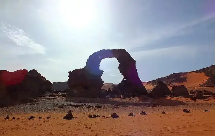 هبطنا في جانت، في المنطقة الجنوبية الشرقية للجزائر بالقرب من حدود ليبيا بعد ظهر يوم ضبابي. كان ينتظرنا المرشد السياحي الخاص بنا عند دائري الأمتعة. كان رجلًا صفصافًا وبهيجًا، وكان يرتدي غطاء رأس أرجوانيٍّ مميز ومعروف لدى قبيلة الطوارق، الشكان الأصليين لصحراء الجزائر، وهو عضو في قبيلة الأمازيغ المهيمنة في جنوب الجزائر. قفزنا إلى سيارة دفع رباعي تابعة لصديق مرشدنا وانطلقنا شرقًا على طول طريق إسفلتي فارغ.