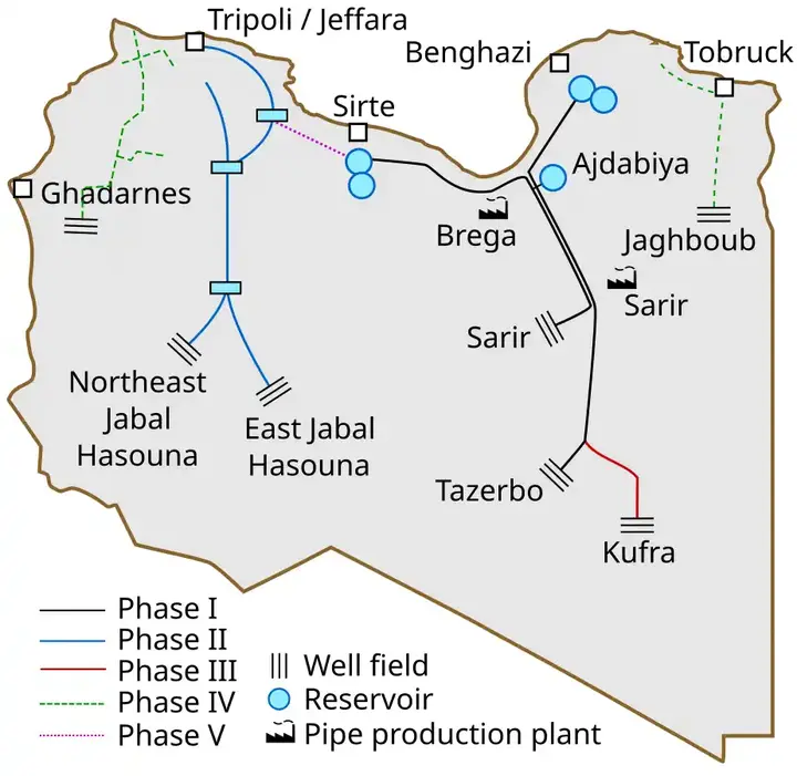 ت. التنمية الاقتصادية: لقد خلق مشروع النهر الصناعي فرص عمل في البناء والزراعة والصيانة، مما ساهم في اقتصاد ليبيا. بالإضافة إلى ذلك، فقد قلّل من الحاجة إلى محطات تحلية المياه المُكلفة على طول الساحل.
