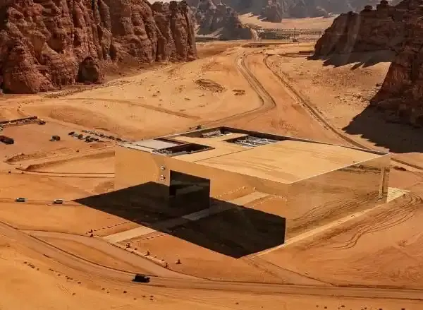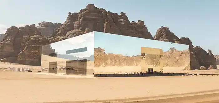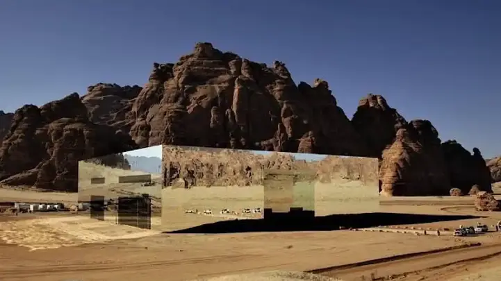 في أول الأمر ستظن أن قاعة مرايا هي مجرد سراب، حيث يمكن للصحراء أن تلعب الحيل بالعقول. ثم بعد وهلة ستدرك أن هناك أمامك حقًا مبنى مغطى بالمرايا بشكل لا يصدق في قلب الصحراء العربية السعودية. مع جبال الحجر الرملي القديمة المنحوتة بالرياح تنعكس على سطحها اللامع، بحيث يبدو أن الهيكل يختفي ثم يظهر مرة أخرى من المناظر الطبيعية.
