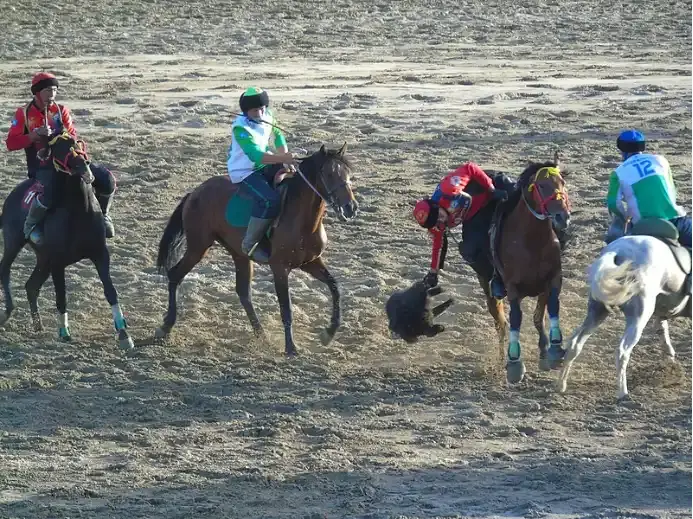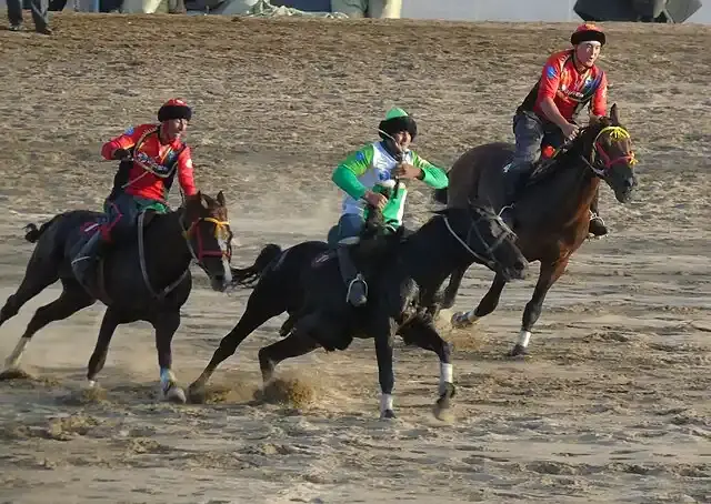 هذه اللعبة هي المفضلة في الألعاب. وتُعرف في مختلف أنحاء المنطقة باسم "كوكبار" و"كوك بورو" و"أولاك تارتيش" و"بوزكاشي"، بحسب اللغات. وهي تشابه لعبة الركبي على ظهور الخيل مع عنزة ميتة ككرة. يتنافس فريقان يتألف كل منهما من سبعة فرسان على الإمساك بجثة عنزة (مصنوعة من المطاط لهذه الألعاب)، ورفعها تحت أرجلهم، والركض بسرعة نحو خط الفريق المنافس ثم إلقائها في حلقة من الحبل أو في دائرة بلاستيكية كبيرة. تتّسم اللعبة بالخشونة والعنف؛ فالأصابع المكسورة والأذنان الممزقتان من الأمور المعتادة فيها، وأهم سمة للاعب "كوكبار" هي أن يكون قوياً وشجاعاً ولا يخاف. في العصور القديمة، كان الرجال يصطادون الذئاب ويتقاتلون من أجل شرف حمل الحيوان وإعادته إلى القرية.