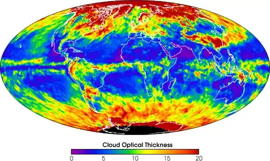 تكشف بيانات الأقمار الصناعية من وكالة ناسا أن متوسط الغطاء السحابي العالمي يبلغ حوالي 68٪، مع اختلافات كبيرة فوق المحيطات (70-80٪) مقارنة بالأرض (50-60٪).