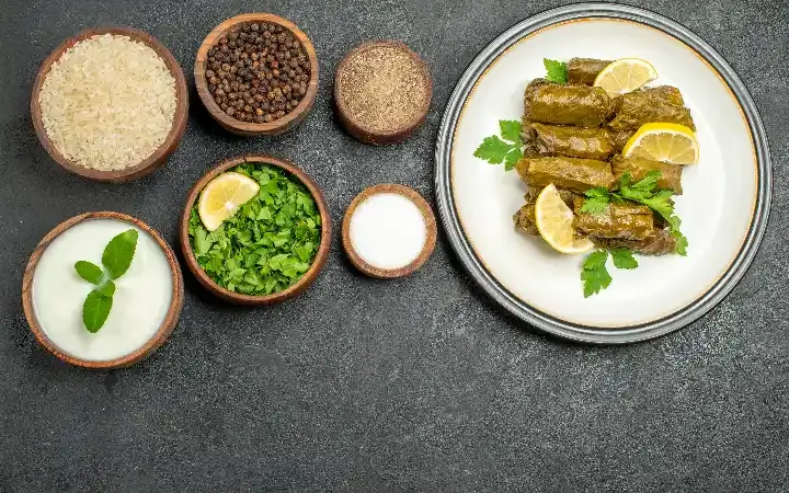 المكونات: الكوسا، الباذنجان، الفلفل، الطماطم، وأوراق العنب، محشوة بالأرز واللحم والتوابل.