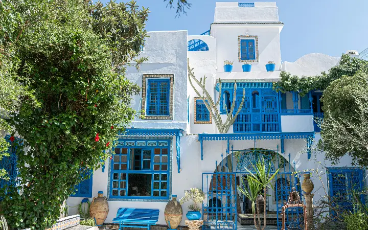 تعد سيدي بوسعيد واحدة من أروع الأمثلة على العمارة الأندلسية في شمال إفريقيا، حيث تتزين شوارعها بالمباني البيضاء والنوافذ ذات المصاريع الزرقاء المميزة. تعكس هذه الألوان تراثًا متجذرًا في الثقافة المتوسطية، حيث يقال إن اللون الأزرق يساعد في إبعاد الأرواح الشريرة ويعزز الإحساس بالهدوء والسكينة. بالإضافة إلى ذلك، تزين الشرفات والأبواب بالنقوش الحديدية الفريدة، مما يضفي لمسة فنية رائعة على كل زاوية في المدينة. يضيف التنسيق العمراني المذهل طابعًا ساحرًا يميز سيدي بوسعيد عن غيرها من المدن التونسية، مما يجعلها مصدر إلهام للرسامين والمصورين الذين يسعون لالتقاط تفاصيلها الخلابة. ويُقال إن المدينة لعبت دورًا في إلهام العديد من المصممين المعماريين الذين استوحوا منها أنماطًا معمارية مماثلة في مناطق أخرى حول العالم.