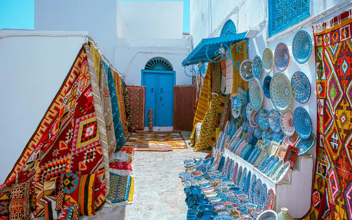 لا يمكن زيارة سيدي بوسعيد دون استكشاف أسواقها الصغيرة التي تعرض أجمل القطع الفنية والحرفية. من الفسيفساء التقليدية إلى المجوهرات الفضية والمشغولات اليدوية، توفر الأسواق المحلية تجربة تسوق فريدة تعكس التراث التونسي العريق. يمكن للزائرين اقتناء التذكارات الفريدة مثل الفوانيس المزخرفة، والسيراميك التقليدي، والمنسوجات المطرزة يدويًا، التي تجسد الجمال والحرفية الدقيقة. كما أن بعض الحرفيين المحليين يقدمون عروضًا حية لكيفية صناعة هذه المشغولات، مما يتيح للزوار فرصة مشاهدة العملية الإبداعية عن قرب. بالإضافة إلى ذلك، تشتهر بعض المحلات بتقديم العطور التقليدية المستوحاة من زهور الياسمين والزهر، والتي تعد هدايا فريدة تعكس سحر المدينة.