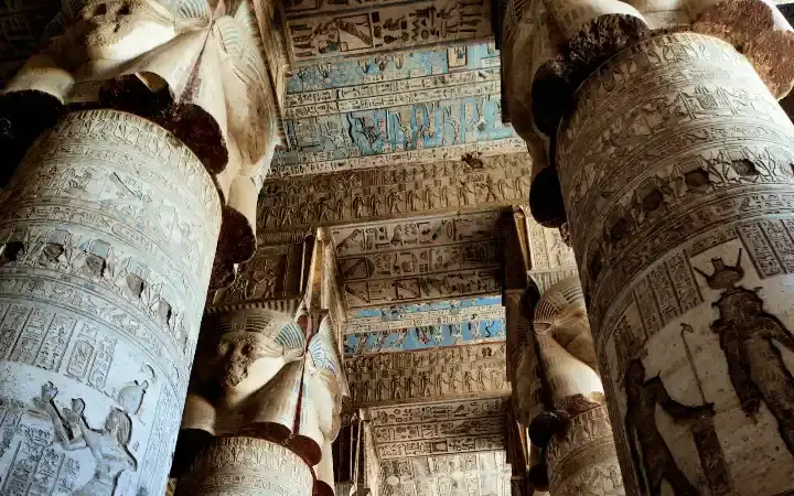 كل بوصة في جدران دندرة تحكِي قصصًا مقدسة. في المُستشفى المقدس، كان الحجاج يلتمسون الشفاء عبر طقوس النوم، حالمين بإرشاد حتحور. تُظهر الجدران الخارجية كليوباترا السابعة وابنها قيصاريون يقدمان هدايا للآلهة — تذكير مؤثر بغروب شمس مصر تحت الحكم الروماني. في الداخل، تُزين وجوه حتحور تيجان الأعمدة، بنظراتها الرقيقة التي تراقب طقوس الموسيقى والرقص.