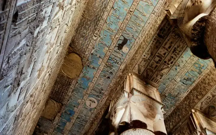 لا يزال سقف القاعة، الذي كان مُزينًا في الماضي بلوحات نابضة بالألوان، يحتفظ ببصمات من الأزرق الكوبالت والذهب، مُشكلًا لوحةً تُحاكي سماء الليل المرصعة بالنجوم. هذه التفاصيل لم تكن جمالية فحسب، بل حملت دلالات دينية وفلكية، حيث ربط المصريون بين النقوش السماوية ودور حتحور كوسيطة بين الأرض والكون.