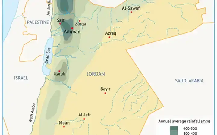 هطول الأمطار السنوي أقل من 200 ملم في معظم المناطق. وعلى الرغم من جماله الطبيعي، بما في ذلك محمية ضانا للمحيط الحيوي ووادي رم، فإن النظم البيئية الهشة في الأردن معرضة بشدة للنشاط البشري وتغير المناخ.