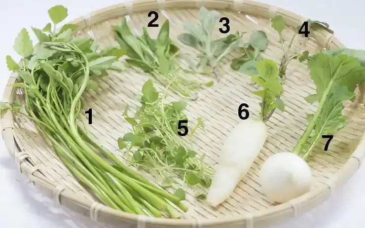 1) سيري (البقدونس الياباني): عشبة معمرة من فصيلة البقدونس، تنمو بريًا في الجبال والحقول في جميع أنحاء اليابان. اسمها مشتق من طريقة نموها "سيري" التي تعني "تنافسية". اسمه مشتق من نموه كـ"سيري كاتسو" (تنافس واربح)، ولذلك يرتبط بالحظ السعيد. يتميز برائحته الفريدة التي تحفز الشهية، كما أن له تأثيرًا مفيدًا على المعدة والأمعاء. كما أنه لذيذ كسلطة أو طبق مسلوق.