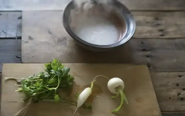 6) سوزوشيرو: قد يعرفه البعض باسم دايكون. إنه نبات صغير الحجم لم يكبر. اسم "سوزوشيرو" يعني النقاء والبراءة. الجذر الأبيض يحتوي جزء من النبات على كمية كبيرة من إنزيم الدياستاز، وهو مادة تُعزز هضم الطعام. ومثل السوزونا، تُعدّ أوراقها غنية بفيتامين ج والمعادن.