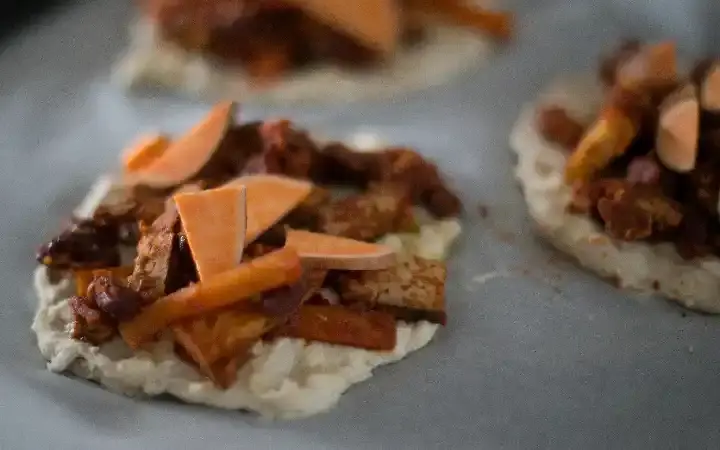 اغسل البطاطا الحلوة وقطعها إلى نصفين، ثم ضعها في الفرن لمدة 40 دقيقة حتى تصبح طرية.
