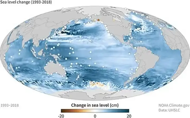 ارتفاع متوسط مستوى سطح البحر في معظم محيطات العالم (الألوان الزرقاء)