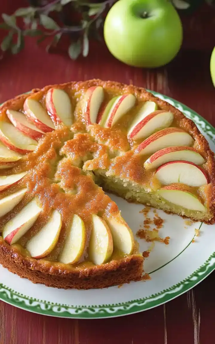 قوموا بتسوية العجينة باستخدام ملعقة، ثم رشوا السكر على السطح. الآن، نأتي للتفاح: اغسلوه جيدًا وقطعوه إلى شرائح رقيقة. وزعوا شرائح التفاح على السطح، مع ترك فراغ في المنتصف.
