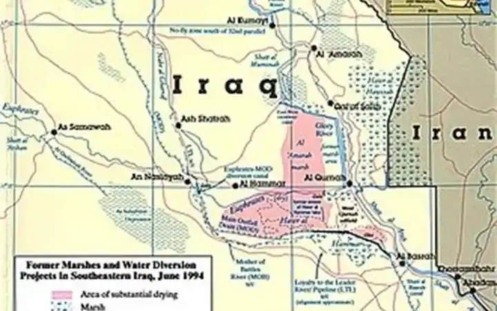 خريطة لأهوار بلاد ما بين النهرين عام ١٩٩٤، مع وجود علامات تصريف.
