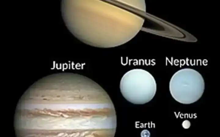 لكواكب الخارجية المشتري وزحل وأورانوس ونبتون، مقارنة بالكواكب الداخلية الأرض والزهرة والمريخ وعطارد في أسفل اليمين.