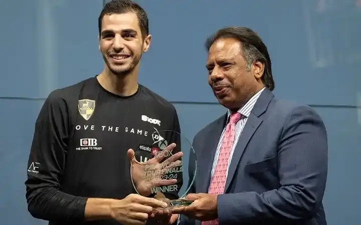 علي فرج يستلم كأس بطولة العالم للرجال من جهانجير خان