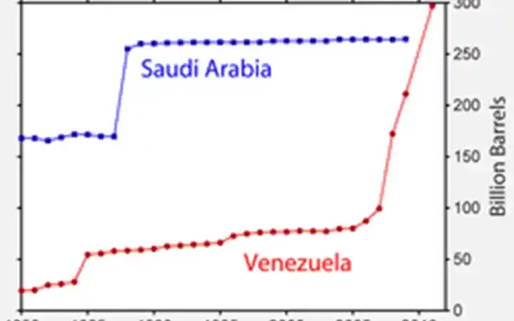 الاحتياطيات المؤكدة المُبلغ عنها للمملكة العربية السعودية (أزرق) وفنزويلا (أحمر)