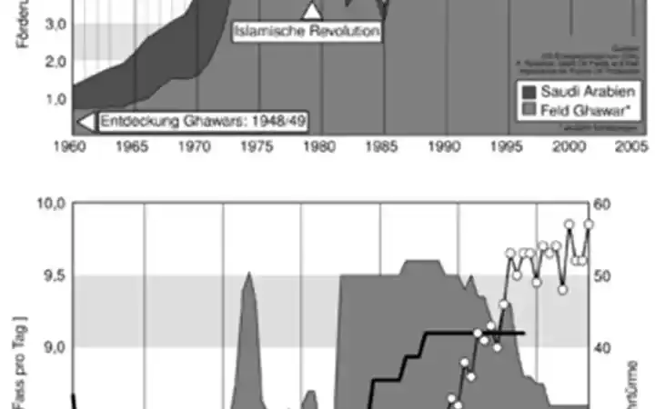 الصورة العليا: إنتاج السعودية الكلي، حقل الغوار الصورة السفلى: مقارنة بين كمية استخراج النفط وتزايد عدد الآبار في السعودية
