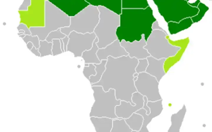 أعضاء في جامعة الدول العربية (أخضر قاتم) ومنطقة التجارة الحرة العربية الكبرى (أخضر فاتح).