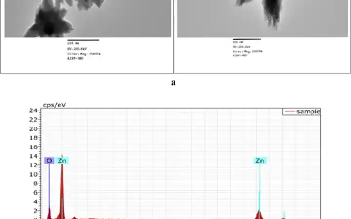 زهور نانوية من أكسيد التوتياء (a) وتحليلها العنصري (b).