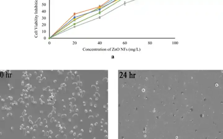 (ب) أظهرت صور المجهر الإلكتروني الماسح لمزارع الإشريكية القولونية المعالجة باستخدام الزهور النانوية من أكسيد التوتياء انخفاضاً ملحوظاً في كثافة الخلايا البكتيرية عند نقطة زمنية قدرها 24 ساعة، مقارنةً بنقطة زمنية قدرها 0ساعة.