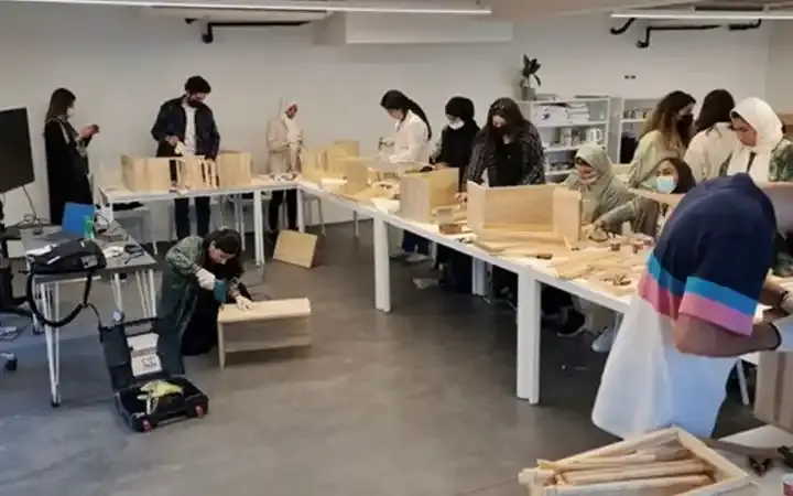 مجموعة من هواة تربية النحل يتعلمون كيفية صنع صناديق خلايا النحل خلال ورشة عمل في جدة، يقدمها رائد أعمال العسل أحمد بادغاهيش