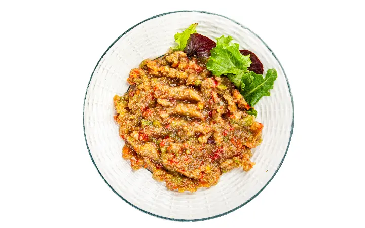 نقلي الباذنجان حتى يصبح ذهبي اللون، ثم نقليه جانبًا. في مقلاة أخرى، نحمّر الفلفل والثوم، ثم نضيف الطماطم ونتركها حتى تتكاثف. نخلط الخليط مع الباذنجان ونتركه يبرد. تُقدَّم باردة وتُزيَّن بالبقدونس.