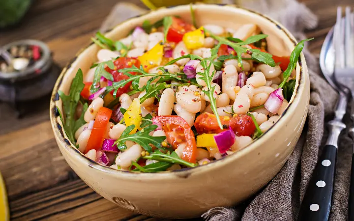 نخلط الفاصوليا مع الطماطم والبصل، ثم نضيف التتبيلة المكونة من الليمون والخل والزيت والبهارات. تُزيَّن بشرائح البيض والبقدونس. تُقدَّم بدرجة حرارة الغرفة.