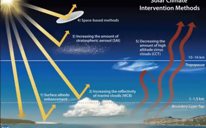 مخطط يوضح خمس طرائق مقترحة لتقنيات تعديل الإشعاع الشمسي