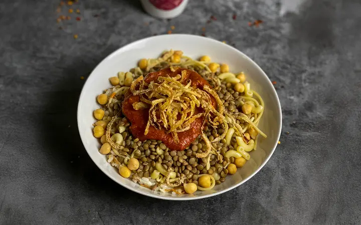 الكشري هو طبق "الشارع" الذي أصبح أيقونة لمصر. يجمع بين العدس، الأرز، المكرونة، الحمص، البصل المقلي، والصلصة الحارة. الأجانب غالباً ما يتفاجأون كيف يمكن لمكونات يومية عادية أن تصبح طبقاً غنياً ومشبعاً بهذا الشكل. ما يميز الكشري أيضاً هو أنه يعكس روح القاهرة الصاخبة، حيث تنتشر محلاته في كل شارع تقريباً. يقال إن أصل الكشري جاء من الهند، لكن المصريين أعادوا ابتكاره وأضافوا إليه لمستهم الخاصة ليصبح جزءاً من الهوية الوطنية.