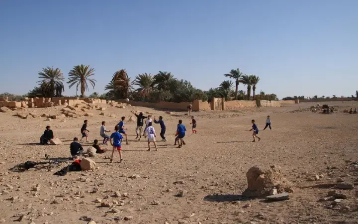 أطفال يلعبون كرة القدم قرب آثار تدمر