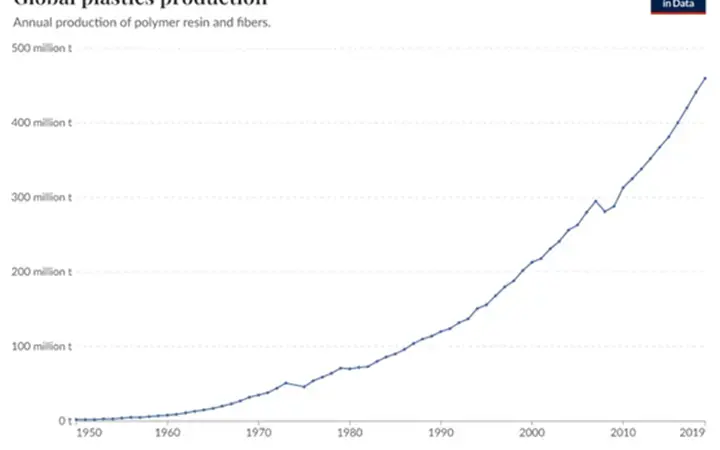 وفقاً لمصدر موثوق: ارتفع الإنتاج العالمي من البلاستيك (الراتنجات والألياف) من حوالي مليوني طن عام 1950 إلى حوالي 380 مليون طن عام 2015. مجموعة بيانات أخرى: في عام 1950، أنتج العالم حوالي مليوني طن فقط، وزاد الإنتاج السنوي بنحو 200 ضعف بحلول عام 2015 (إلى حوالي 381 مليون طن). يشير تقرير "توقعات البلاستيك العالمية" الصادر عن منظمة التعاون الاقتصادي والتنمية إلى أن الإنتاج السنوي تضاعف من حوالي 234 مليون طن في عام 2000 إلى حوالي 460 مليون طن في عام 2019.