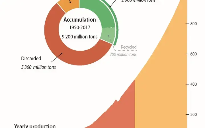 مع توسع الإنتاج، توسعت النفايات أيضاً. يُنتج العالم الآن مئات الملايين من الأطنان من النفايات البلاستيكية سنوياً: ووفقاً لـ "توقعات البلاستيك العالمية"، أنتج العالم حوالي 353 مليون طن من النفايات البلاستيكية في عام 2019.. كما أن تراكم النفايات ملفت للنظر: بحلول عام 2015، تم إنتاج حوالي 6300 مليون طن من النفايات البلاستيكية (منذ عام 1950)، مع إعادة تدوير حوالي 9% فقط، وحرق حوالي 12%، وتراكم حوالي 79% في مكبات النفايات أو البيئة الطبيعية.