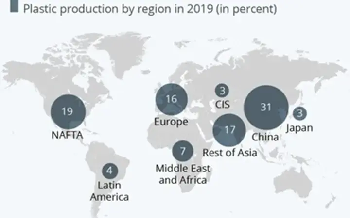 نقلاً عن بيانات الصناعة: في عام 2020، شكلت الصين حوالي 31% من إنتاج راتنج البلاستيك العالمي؛ واليابان حوالي 3%؛ وبقية آسيا حوالي 17%؛ واتفاقية التجارة الحرة لأميركا الشمالية حوالي 19%؛ أوروبا حوالي ~16%؛ الشرق الأوسط وأفريقيا حوالي ~7%.
