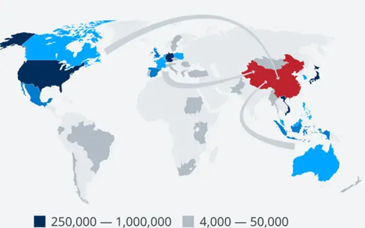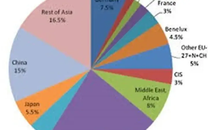 وهكذا، تحوّل التوزيع الإقليمي بمرور الوقت: فبينما هيمنت أوروبا وأمريكا الشمالية في وقت مبكر، شهدت شرق آسيا (وخاصةً الصين) نمواً سريعاً. وقد ساهم حجم الطاقة التصنيعية، وتكلفة المواد الخام، والتصنيع النهائي (الإلكترونيات، والسلع الاستهلاكية)، والصناعة الموجهة للتصدير في دفع هذا التحول.