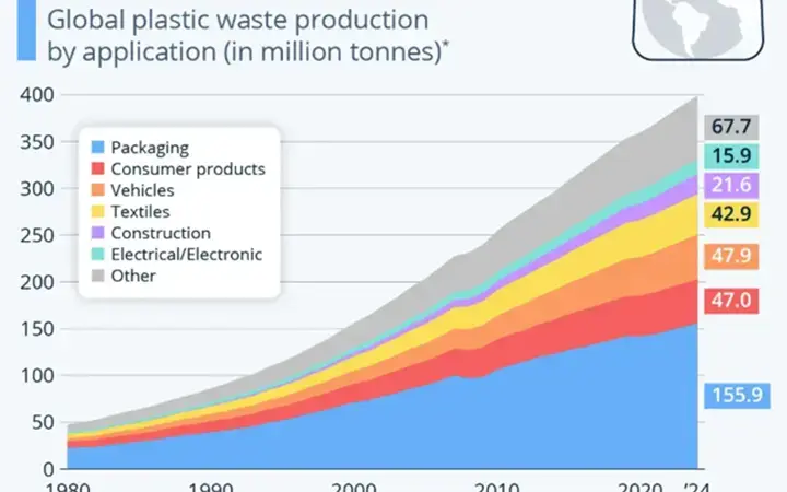 إحصائية أخرى: في عام 2023، يُقدر إنتاج 158.9 مليون طن من النفايات البلاستيكية، وسيُساء إدارة 43% منها (68.6 مليون طن) عالمياً.