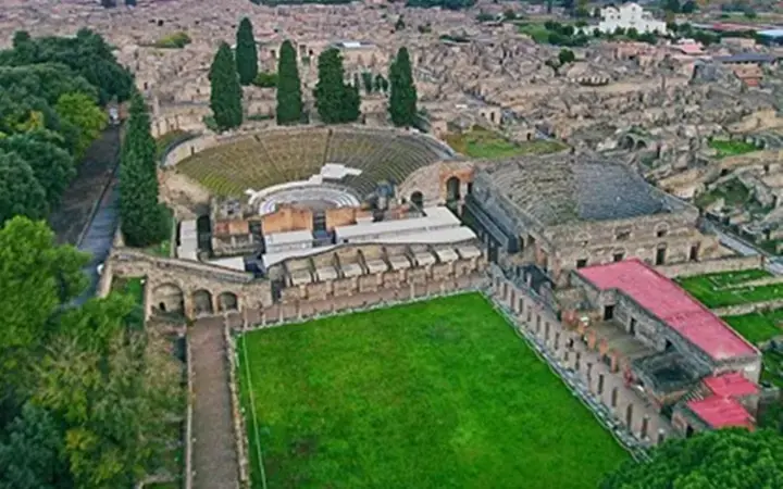 مسارح بومبيي كما تُصوَّر من الأعلى بطائرة بدون طيار، وفي الخلفية جبل فيزوف.
