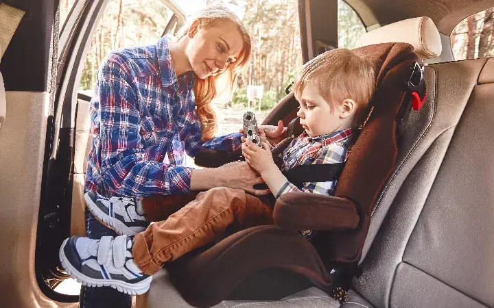 كما يجب الانتباه إلى نظام الأحزمة الداخلي، حيث يفضل أن يكون بخمس نقاط تثبيت لتوزيع القوة بشكل متوازن على جسم الطفل.
