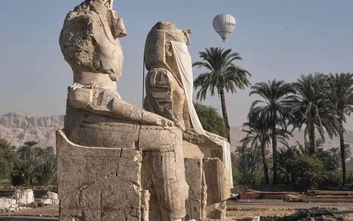 منطاد الهواء الساخن يطير فوق تجمع تمثالين عملاقين من المرمر للفرعون أمنحتب الثالث، قبل الافتتاح الرسمي، في مدينة الأقصر جنوب مصر