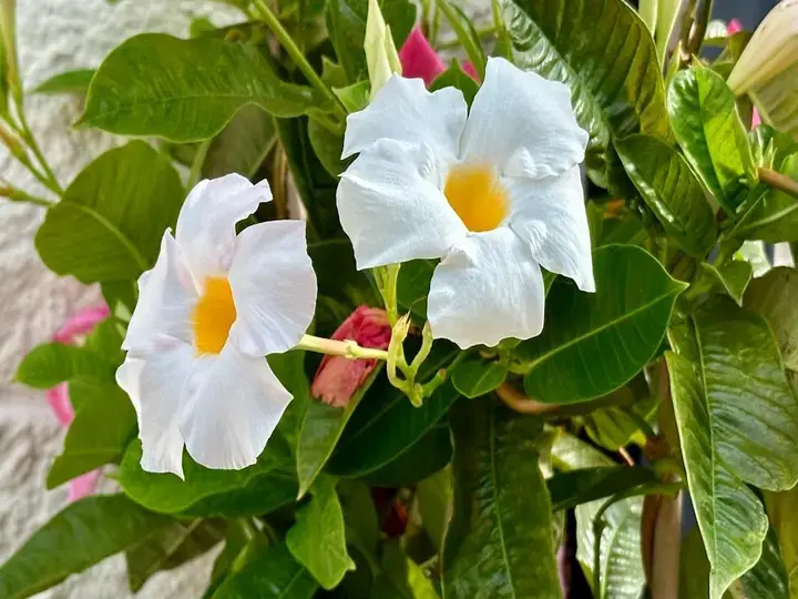 اقترب من النبتة واعتبر الأوراق، فهي من أوضح العلامات المميزة. تظهر أوراق مانديفيلا في أزواج على طول الساق، بملمسها الناعم الجلدي. تتميز بلون أخضر داكن متين بسطح لامع شبه عاكس. يتراوح طول كل ورقة بين 2 إلى 8 بوصات، مما يوفر خلفية قوية للأزهار البارزة. السيقان نفسها سلكية لكنها قوية، تدعم النبتة وهي تسعى للوصول إلى ضوء الشمس. لاحظ ترتيب وتباعد الأوراق - وهو نمط منتظم يدل على طبيعتها المتسلقة.