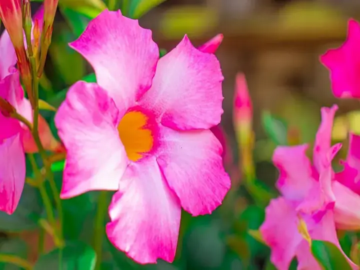 هنا يكمن السمة الأكثر تحديدًا: الأزهار الشبيهة بالبوق. تعتبر أزهار مانديفيلا نموذجاً بارعاً في التصميم، بحلق كريمي اللون يبهت بشكل دراماتيكي إلى ألوان زاهية عند حواف البتلات. توقع العثور على ألوان مثل الوردي، الأحمر، الأبيض، وحتى الأصفر. هذه الأزهار ليست فقط ذات جاذبية جمالية بل هي أيضًا عملية، مصممة لجذب الملقحات برائحتها الحلوة الرقيقة. عند محاولة التعرف على النبتة، انظر إلى بنية الزهرة الأنبوبية وكيف تفتح إلى خمس بتلات مستديرة. تقدم الأزهار بطبيعتها التكتلية مظهراً مبهجاً عادة ما يظلل الأوراق تحتها.