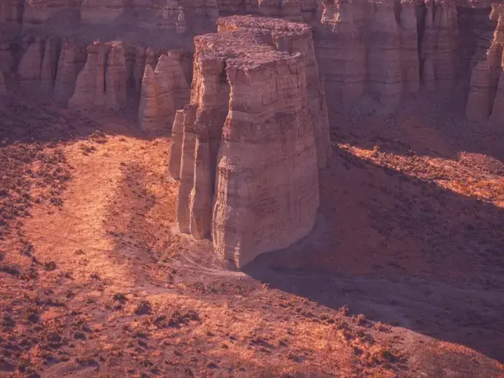 وهذا هو معنى التعرية التفاضلية بلغة بسيطة: فالمادة الأضعف تتآكل أسرع، أما المادة الأشد صلابة فتصمد مدة أطول. ويمكنك أحيانًا أن تلمح ذلك حين تشكل طبقة أغمق لونًا أو أشد تماسُكًا الحافة العليا لهضبة صغيرة أو نتوء، بينما تتفتت المنحدرات الشاحبة تحتها وتتراجع.