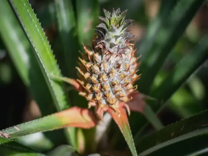 لكن المشهد في الحقل يكاد يكون عكس هذا التصور. فبحسب أدلة البستنة الصادرة عن جامعة فلوريدا، يُوصَف نبات الأناناس بأنه نبات عشبي استوائي منخفض النمو، له وردة من أوراق طويلة شبيهة بالسيوف، وتخرج الثمرة من وسطه على ساق زهرية قصيرة. فما يبدو دراميًا في يدك، إنما يأتي في الواقع من نبات يظل منخفضًا ومتماسكًا.