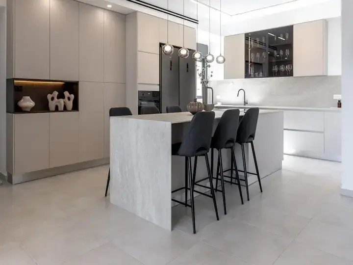ثم تأتي الجزيرة. ففي المطبخ المفتوح، لا تؤدي الجزيرة وظيفة حمل المقاعد العالية أو توفير مساحة للتحضير فقط، بل تعمل كمفصل بين الطهي والتجمّع. يمكنك العمل من جهة، والاتكاء أو الحديث أو التقديم من الجهة الأخرى. وهذا العنصر يصنع حدًّا اجتماعيًا.