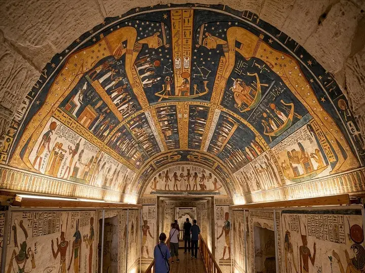 إذا كنت تقف عند الدرج وتحاول أن تستوعب KV9 دفعة واحدة، فابدأ بالحقل الأزرق والذهبي فوقك. فهذا ليس حشوًا زخرفيًا. بل هو أسرع مدخل إلى تصميم المقبرة، لأن أسقف المقابر المصرية كانت كثيرًا ما ترمز إلى السماء فوق الموتى والآلهة.