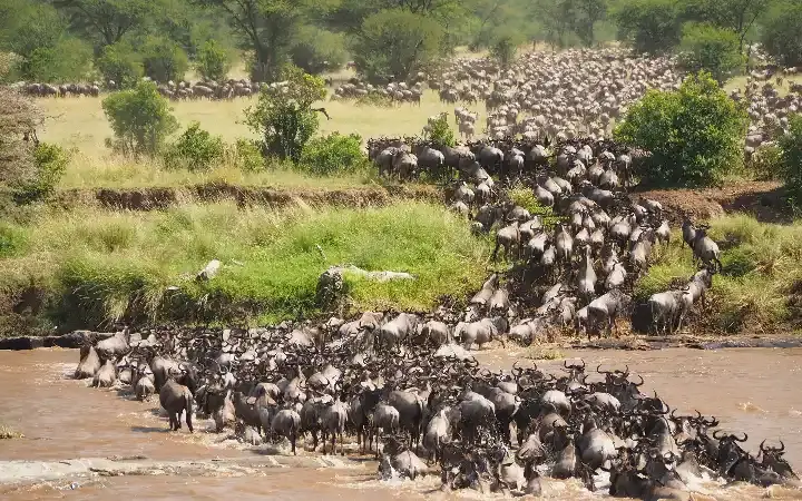 من أخطر مراحل الهجرة عندما تضطر القطعان لعبور نهر مارا المليء بالتماسيح الجائعة التي تترصد الفرائس بسهولة. هذا المشهد يعد واحدًا من أكثر المشاهد الدرامية والملحمية في الحياة البرية.